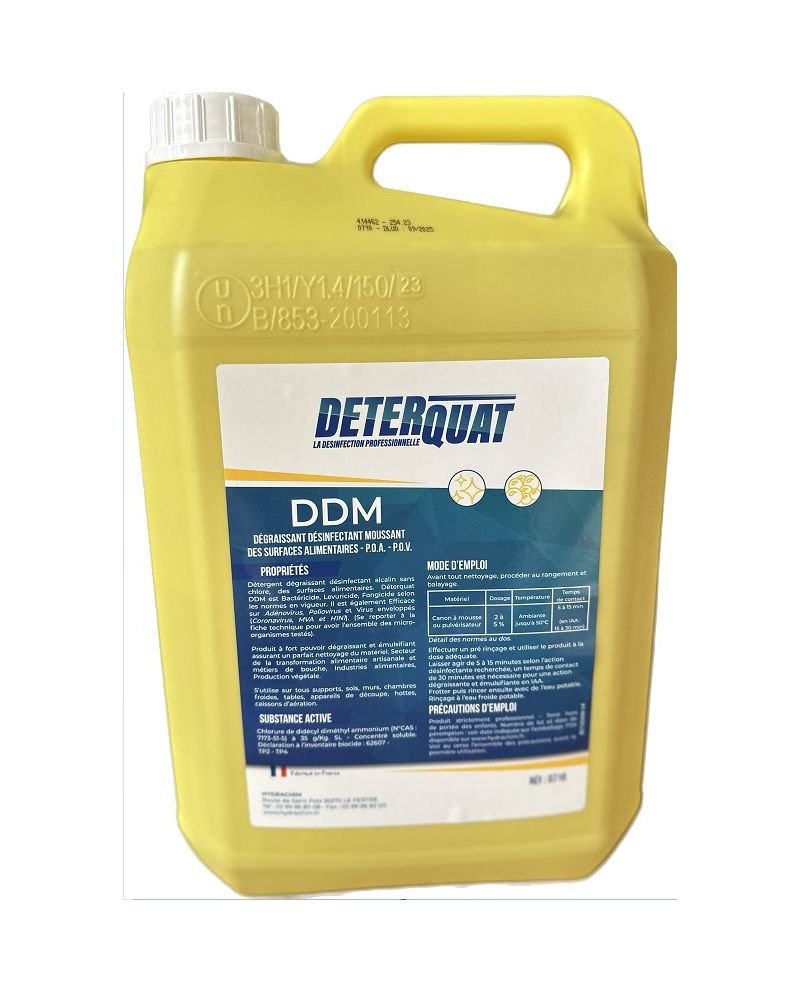 Le dégraissant désinfectant alimentaire DETERQUAT DDM 5L est un produit professionnel deux-en-un, parfaitement adapté à l’entretien des surfaces en milieu alimentaire. Sa formule puissante, sa conformité aux normes et son format économique en font un indispensable pour toute entreprise souhaitant garantir propreté et sécurité au quotidien.